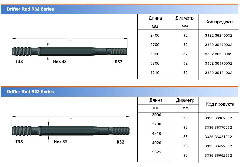 Пробойник R32 доступен в стандартной длине: 1000 мм, 1500 мм, 2000 мм, 3050 мм, 3660 мм, 4270 мм, 4880 мм и 5500 мм.
