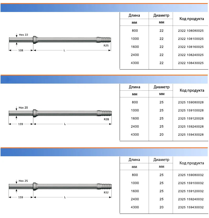 Стержень с хвостовиком H22 имеет различные характеристики, в зависимости от длины и диаметра стержня. Наиболее распространенные размеры: 22x400 мм, 22x600 мм, 22x800 мм и 22x1000 мм. Он также доступен с различными типами резьбы, включая R22, R23 и T22.